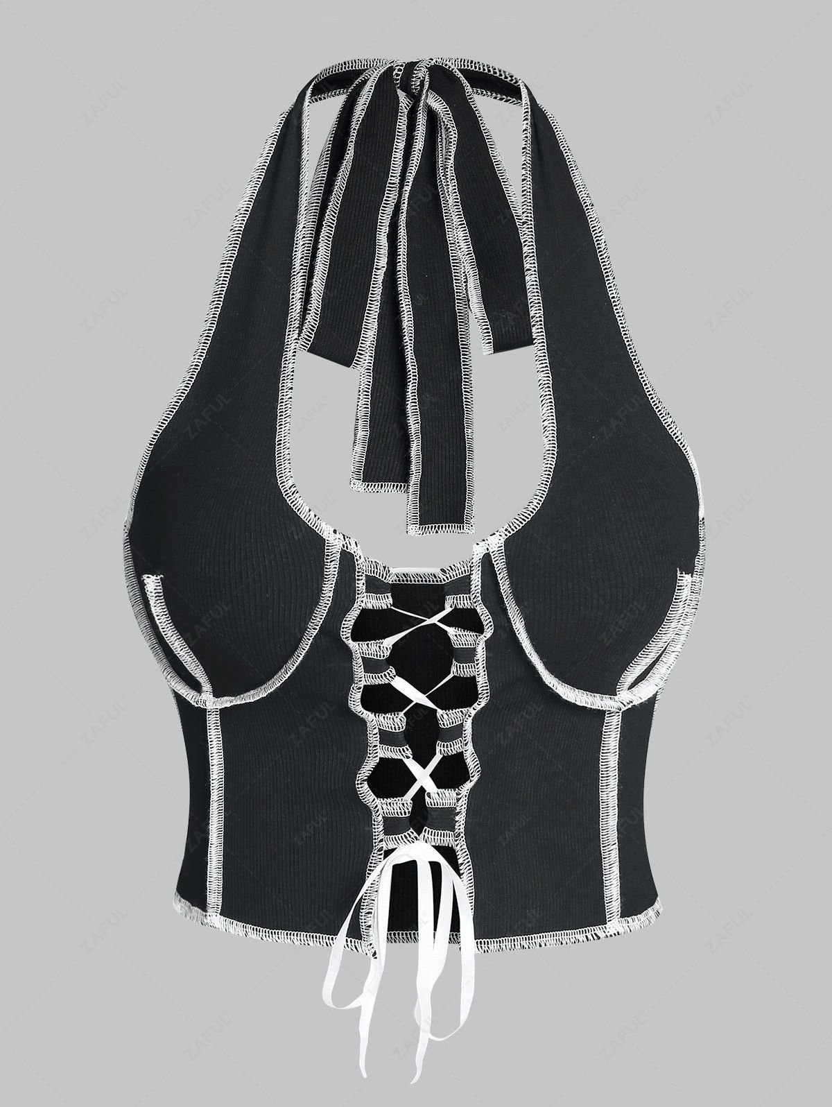 ZAFUL Topstitching Ribbed Lace Up Halter Tank Top – Black S
